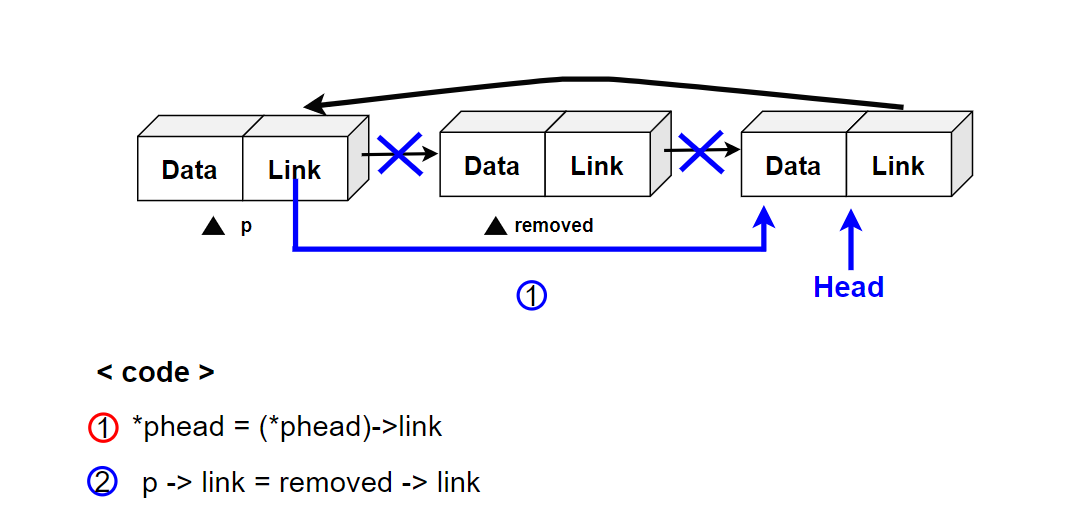 - removed : 삭제될 노드를 가르키는 포인터 ( ❗❗ 노드를 동적할당 받았으면 반드시 삭제할 노드는 연결리스트 변경 후 메모리 해제시켜주기❗❗ )
