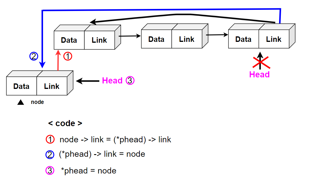: (1)번의 과정 후 삽입하는 노드를 head 노드로 변경시켜주면 된다.