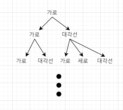 위 처럼 각 방향마다 이동 반경이 정해져 있고, 시작은 무조건 가로 방향부터 시작하니 아래 트리처럼 나타낼 수 있습니다.